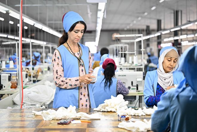 9月12日,在塔吉克斯坦哈特隆州丹加拉区,工人在中塔合作项目丹加拉农业纺织产业园成衣车间工作。(李任滋 摄)